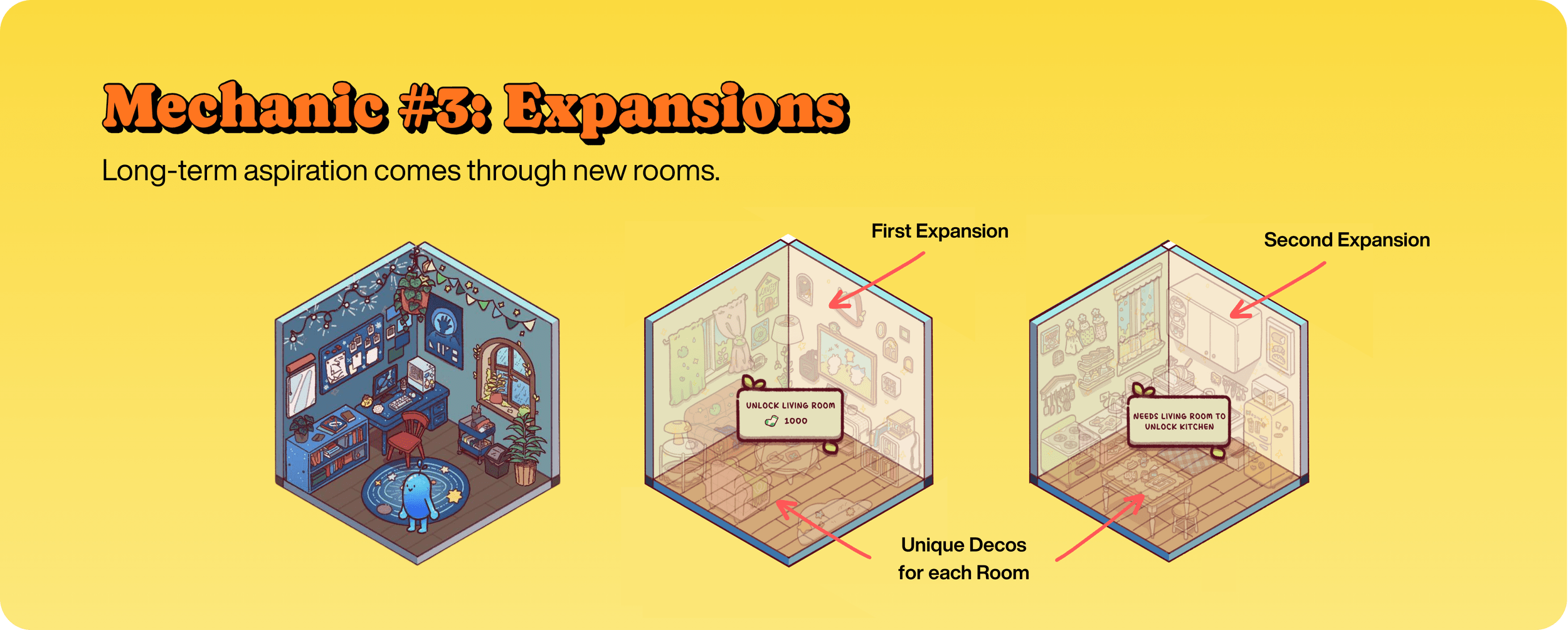 Người dùng bắt đầu với phòng ngủ hoặc phòng làm việc, sau đó mở khóa thêm — đáng chú ý nhất là phòng khách, tiếp theo là bếp — mỗi phòng đòi hỏi lượng tiền tệ nhiều hơn hẳn các lần nâng cấp trước. Cấu trúc chi phí leo thang này đảm bảo việc mở rộng cảm thấy xứng đáng, không phải may mắn tình cờ, biến chúng thành những cột mốc dài hạn rõ ràng thay vì unlock thông thường.