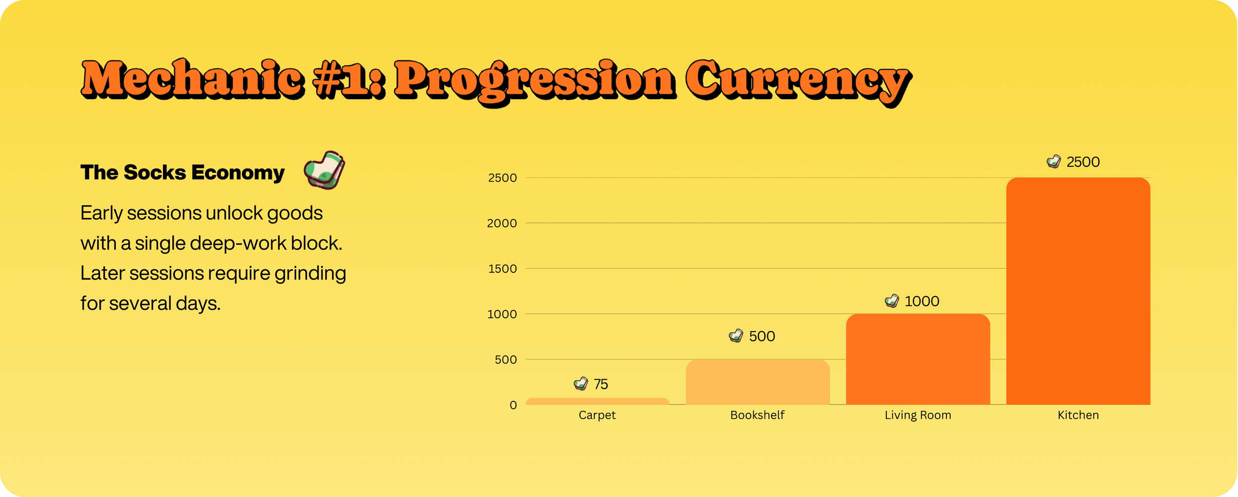 Tất là loại tiền tệ chính để mở khóa tiến trình trong app: bạn phải tiêu tiền để xây ngôi nhà đẹp của mình. Focus Friend hoàn toàn có thể tặng thẳng vật phẩm cho người dùng, nhưng họ chọn tiền tệ vì hai lý do quan trọng: (i) trao cho người dùng quyền lựa chọn cách trang trí và xây dựng; (ii) linh hoạt điều chỉnh phần thưởng theo độ dài phiên làm việc. Tiền tệ cũng là công cụ quan trọng cho nhà phát triển: các đòn bẩy cân bằng kinh tế. Mua sắm ban đầu chỉ tốn vài trăm tất, trong khi các công trình giữa và cuối game cần đến hàng nghìn. Tiến trình dễ ở đầu, thử thách hơn về sau.